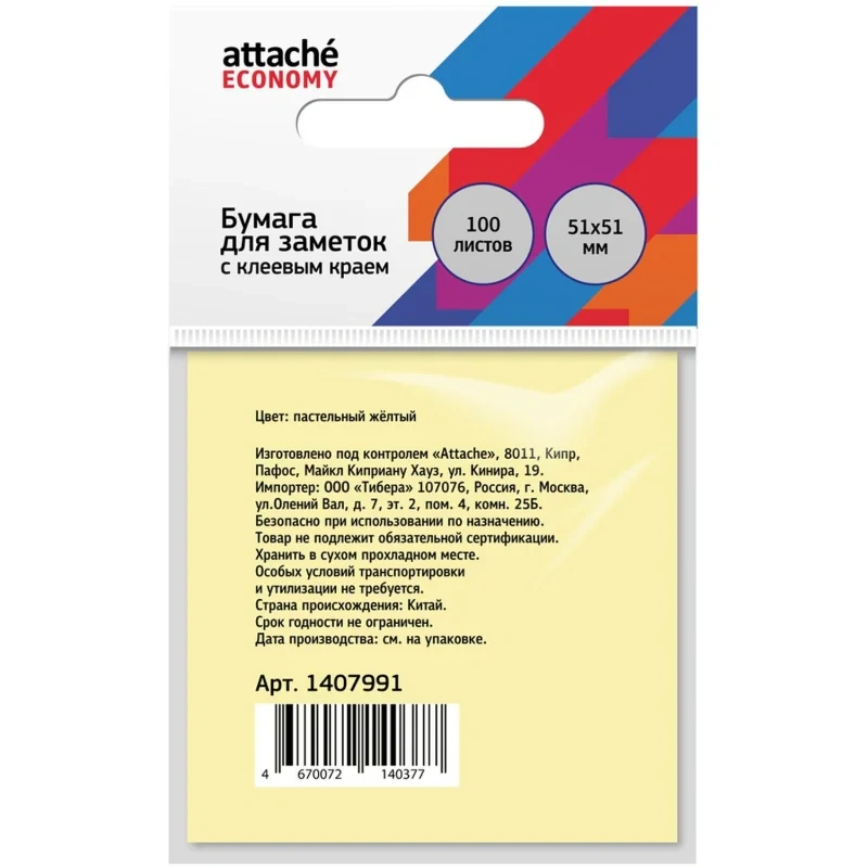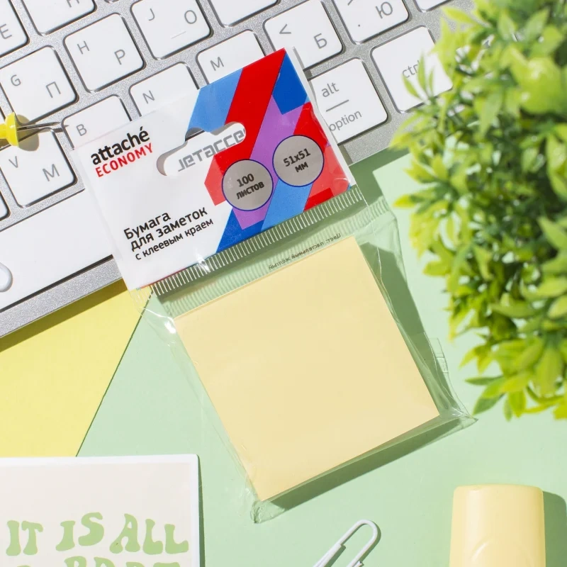 Бумага для заметок с клеевым краем Economy 51x51 мм 100 л пастельный желтый Стикеры Attache Economy подходят для использования в офисе, дома, во время обучения. Формат: 51x51 мм. Клеевая система - 18 Н/м. Длина клейкой стороны 51 мм. 1 блок из 100 листов упакован в термопленку. Цвет: пастельный желтый. Особых условий хранения не требует, сертификации не подлежит, срок годности не ограничен. Чтобы увеличить срок службы стикеров, пожалуйста, следуйте рекомендациям: 1) Отделять стикер от блока следует вдоль клеевой полосы. Так можно избежать скручивания и последующего отклеивания стикера. 2) Прежде чем наклеивать стикер, убедитесь в отсутствии грязи и пыли на поверхности. На чистой поверхности срок службы клеевого слоя более продолжителен. Товар относится к ценовому сегменту 'суперэконом'. Имеет упрощенные характеристики и более простую упаковку. Отвечает основным требованиям потребления.