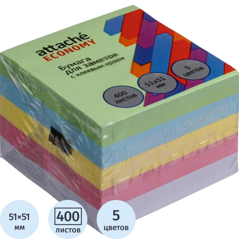 Бумага для заметок с клеевым краем Economy 51x51 мм, 400 л, 5 цв в асс Стикеры Attache Economy подходят для использования в офисе, дома, во время обучения. Формат: 51x51 мм. Клеевая система - 18 Н/м. Длина клейкой стороны 51 мм. 1 блок из 400 листов упакован в термопленку. 5 пастельных цветов: пурпурный, желтый, оранжевый, розовый, зеленый. Особых условий хранения не требует, сертификации не подлежит, срок годности не ограничен. Чтобы увеличить срок службы стикеров, пожалуйста, следуйте рекомендациям: 1) Отделять стикер от блока следует вдоль клеевой полосы. Так можно избежать скручивания и последующего отклеивания стикера. 2) Прежде чем наклеивать стикер, убедитесь в отсутствии грязи и пыли на поверхности. На чистой поверхности срок службы клеевого слоя более продолжителен. Товар относится к ценовому сегменту 'суперэконом'. Имеет упрощенные характеристики и более простую упаковку. Отвечает основным требованиям потребления.