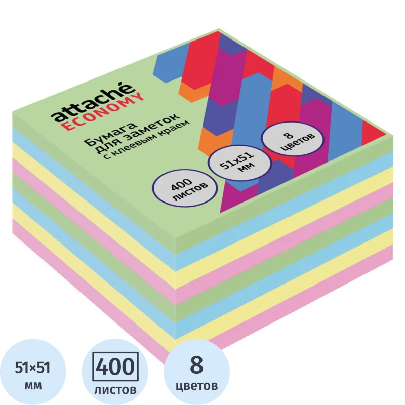 Бумага для заметок с клеевым краем Economy 51x51 мм, 400 л, 8 цветов в асс