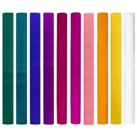Набор состоит из 10-ти рулонов гофрированной (креповой) бумаги размером 50х250 см, плотностью 110 г/м2, удлинением при натяжении, равным 150%. 10 интенсивных и ярких цветов: Желтый, Синий, Изумрудный, Фуксия, Персиковый, Белый, Оранжевый, Фиолетовый, Темно-голубой, Малиновый.