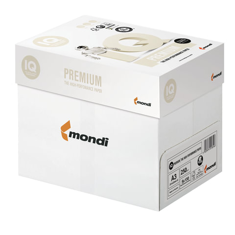 IQ (АйКью) PREMIUM - многоцелевая офисная бумага класса А+. Произведена с использованием технологий TRIOTEC и ColorLok. Идеально подходит для всех видов высокоскоростных принтеров, гарантирует отличный результат лазерной и струйной печати. Характеристики Формат: А3 Класс: А (А+) Белизна по CIE: 170 % Плотность: 250 г/м2 Количество листов в пачке: 150 Сертифицирована по экологическим стандартам FSC и EU Ecolabel: да Количество пачек на палете: 100 Штрих-код: 9003974431758. Производитель: Австрия.