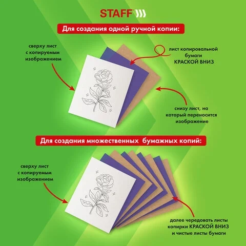 Копировальная бумага упакована в папку из плотного мелованного картона и пленку. Надежная упаковка отлично защитит содержимое от влаги и механических повреждений.
