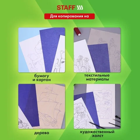 Имеет стандартный формат А4 и односторонний красящий слой синего цвета. Не пачкается. Может использоваться многократно.