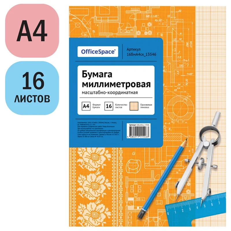 Бумага масштабно-координатная для выполнения чертежей, графиков, схем. Формат А4, 16 листов. Бумага высокого качества, каждый лист оформлен белыми полями. Обложка – мелованный картон, скрепка. Цвет линовки - оранжевый.