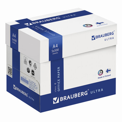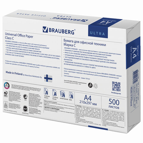 Бумага офисная BRAUBERG ULTRA FINLAND, А4, 80 г/м2, 500 л., марка C, ФИНЛЯНДИЯ, белизна 150% CIE, 11