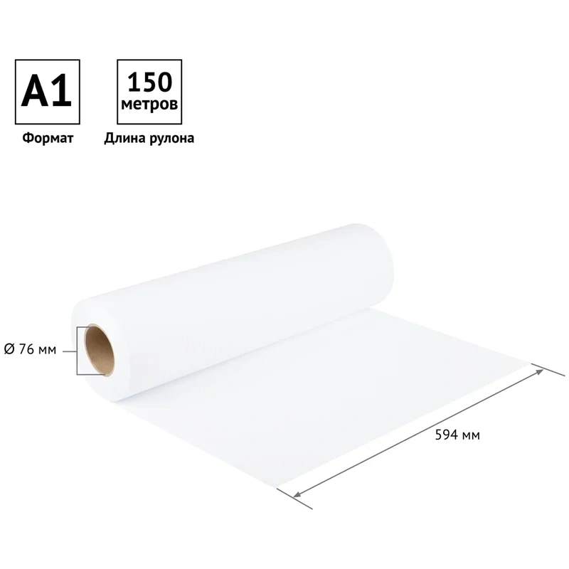 Размер бумажного полотна составляет 594 мм, что соответствует формату А1. Длина рулона - 150 м. Внутренний диаметр втулки - 76 мм.