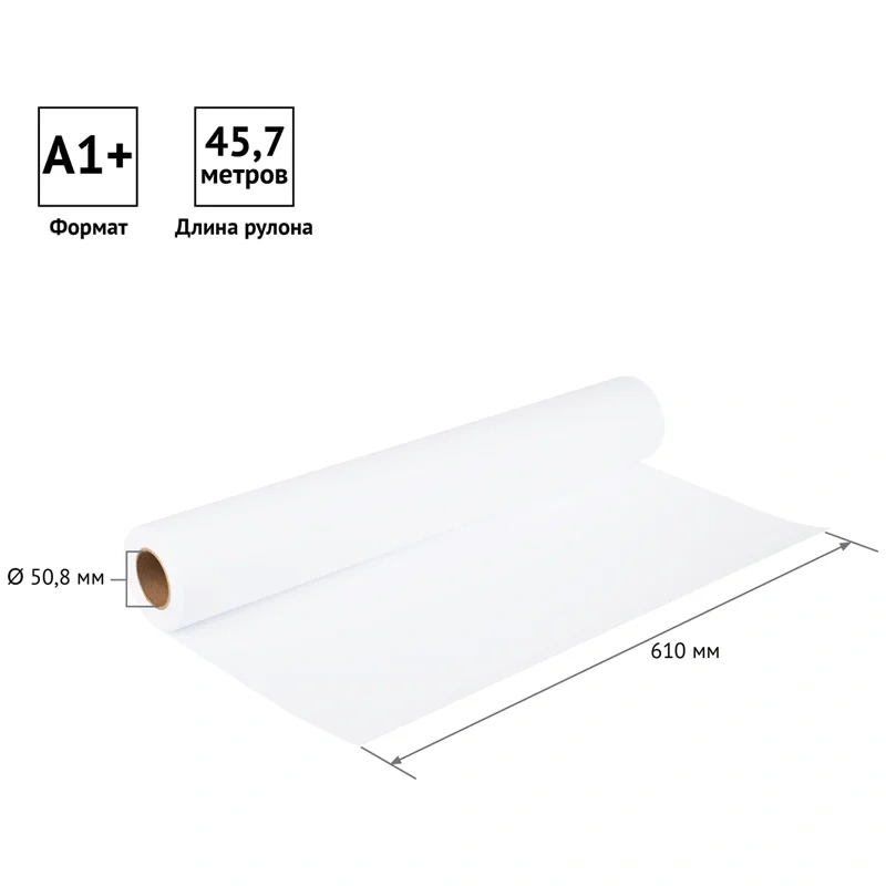 Размер бумажного полотна составляет 610 мм (24 in), что соответствует формату А1+. Длина рулона - 45,7 м (150 ft). Внутренний диаметр втулки - 50,8 мм.