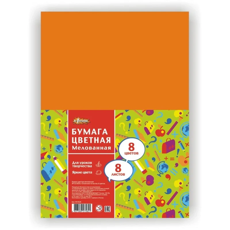 Набор мелованной (8 цветов на 8 листах) цветной бумаги подходит для создания аппликаций, изготовления поделок. Работа с цветной бумагой способствует развитию мелкой моторики у детей. В наборе листы размером 201×282 мм, плотность — 80 г/кв.м. Набор упакован в полиэтиленовый пакет с вкладышем. Цвета в наборе: желтый, зеленый, коричневый, красный, малиновый, оранжевый, синий, черный. В рамках ребрендинга производится перевод данного артикула с ТМ № 1School на ТМ Выбор есть с сохранением всех потребительских характеристик товара. На переходный период допускается поставка данной продукции в двух вариантах дизайна.