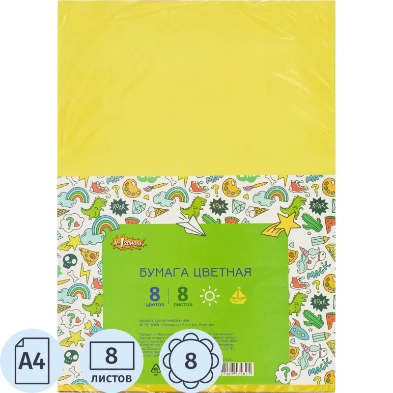 Бумага цветная №1School 8л.8цв.А4 мелован Отличник