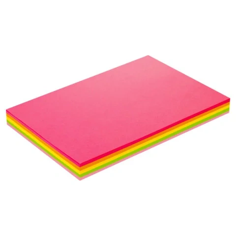 Упакована в пачку из 250 листов формата А4. В упаковке бумага неонового тона 5 разных цветов: малинового, оранжевого, желтого, зеленого и розового. Листы бумаги плотностью 75 г/м2 подходят для офисной техники.
