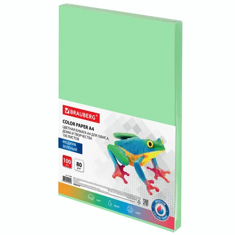 Бумага цветная BRAUBERG, А4, 80 г/м2, 100 л., медиум, зеленая, для офисной техники, 112458
