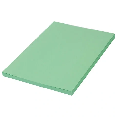 Упакована в пачки по 100 листов формата А4. В упаковке бумага умеренно-насыщенного тона зеленого цвета. Листы бумаги плотностью 80 г/м2 подходят для офисной техники.