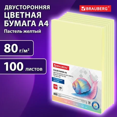 Упакована в пачки по 100 листов формата А4. В упаковке бумага пастельного тона желтого цвета. Листы бумаги плотностью 80 г/м2 подходят для офисной техники.