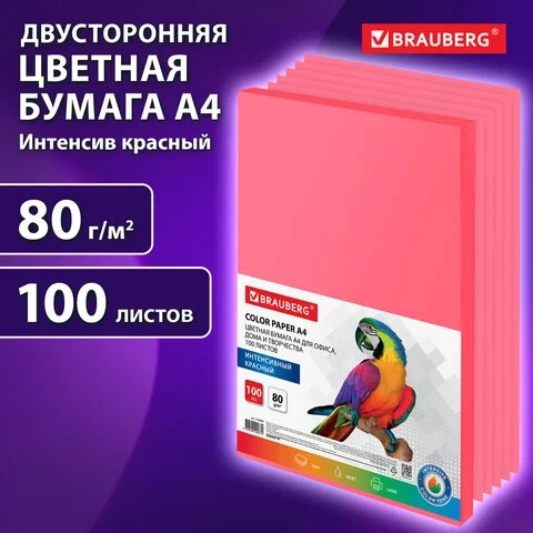 Бумага цветная BRAUBERG, А4, 80г/м, 100 л, интенсив, красная, для офисной техники, 112449