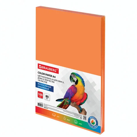 Упакована в пачку из 100 листов формата А4. В упаковке бумага интенсивного тона оранжевого цвета. Листы бумаги плотностью 80 г/м2 подходят для офисной техники.