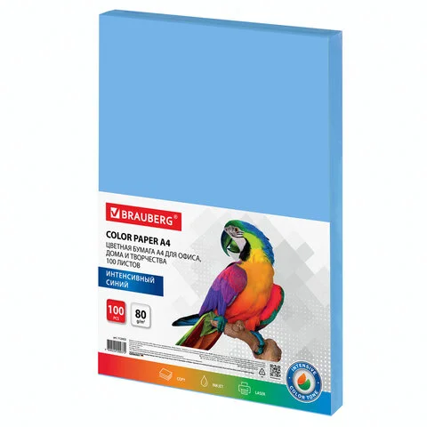 Упакована в пачку из 100 листов формата А4. В упаковке бумага интенсивного тона синего цвета. Листы бумаги плотностью 80 г/м2 подходят для офисной техники.
