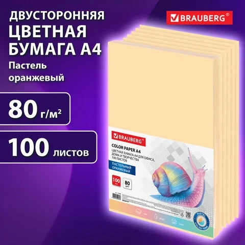 Бумага цветная BRAUBERG, А4, 80г/м, 100 л, пастель, оранжевая, для офисной техники, 112448