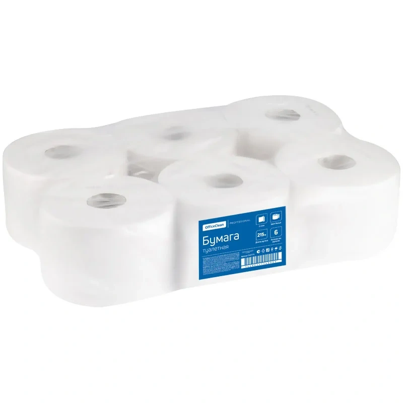 Двухслойная туалетная бумага OfficeClean Professional белого цвета представлена по 6 рулонов в полиэтиленовой упаковке.
