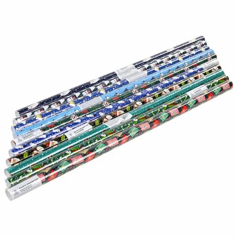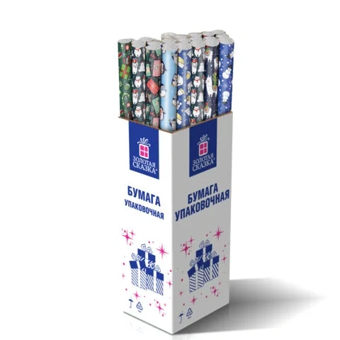 Изготовлена из мелованной бумаги и представлена в 10 новогодних дизайнах. Бумага плотностью 105 г/м2 упакована в рулоны длиной 100 см и шириной 70 см (± 5%). Поставляется в нескольких вариантах дизайна (без возможности выбора).