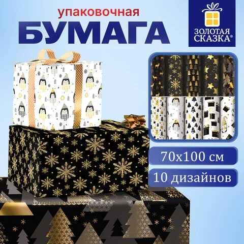 Бумага упаковочная подарочная новогодняя 'Black.Gold.White', 70х100 см, 10 дизайнов ассорти, ЗОЛОТАЯ