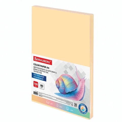Бумага цветная BRAUBERG, А4, 80г/м, 100 л, пастель, оранжевая, для офисной техники, 112448