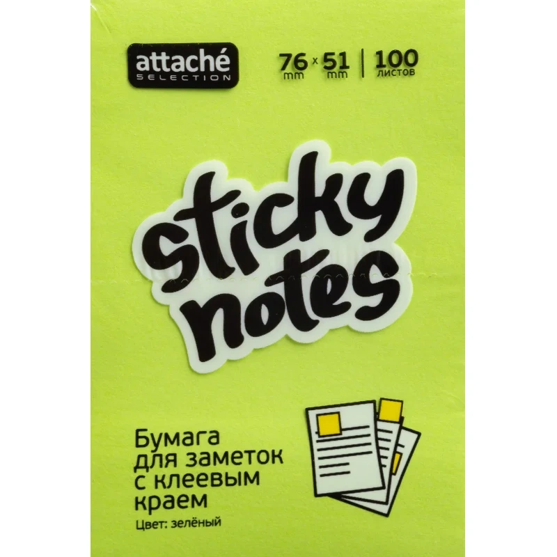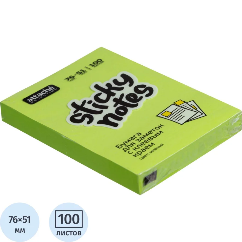 Блок для записей с клейким краем Attache зеленый, неон, 51x76мм, 100 листов