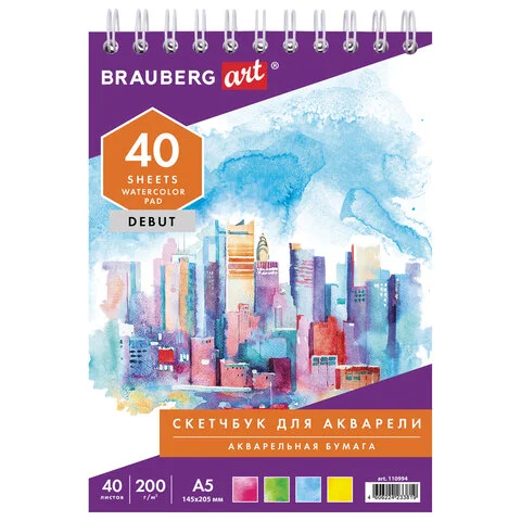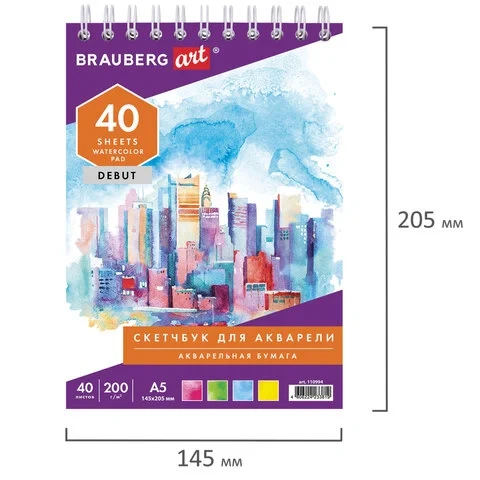 Скетчбук, акварельная белая бумага 200 г/м2 ГОЗНАК, 145х205 мм, 40 листов, гребень подложка BRAUBERG