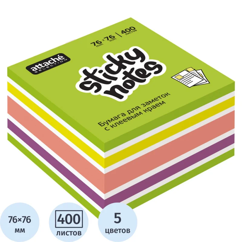 Блок для записей с клейким краем Attache фреш, 5 цветов пастельный и неон, 76х76мм, 400 листов
