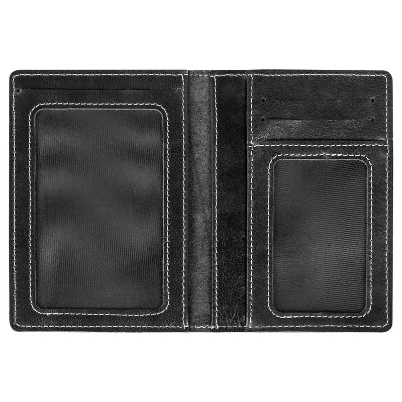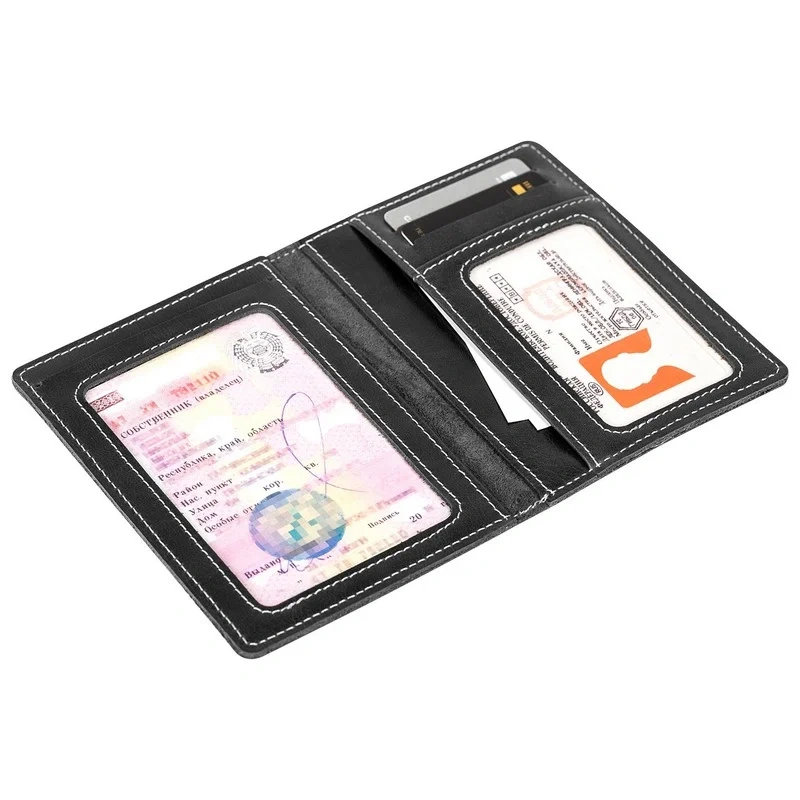 Бумажник для документов из натуральной кожи с декоративной строчкой. Два прозрачных кармана для водительских прав и документов на автомобиль Два глубоких кармана для других документов Два кармана для пластиковых карт Один потайной карман