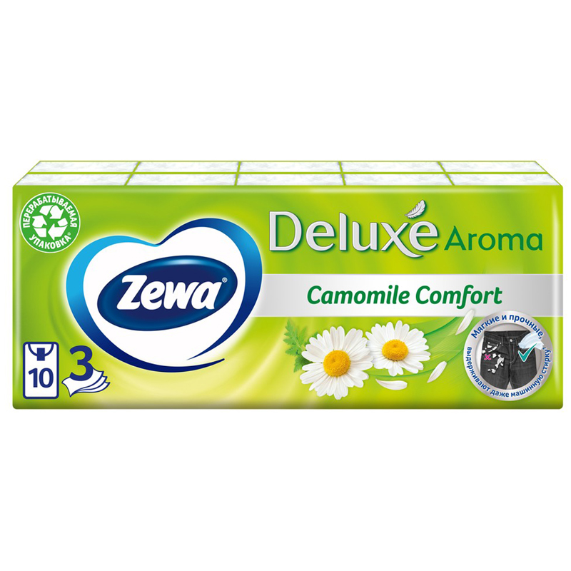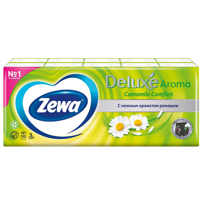 Бумажные носовые платки Zewa Deluxe аромат ромашки, 3 слоя, 10уп х 10шт