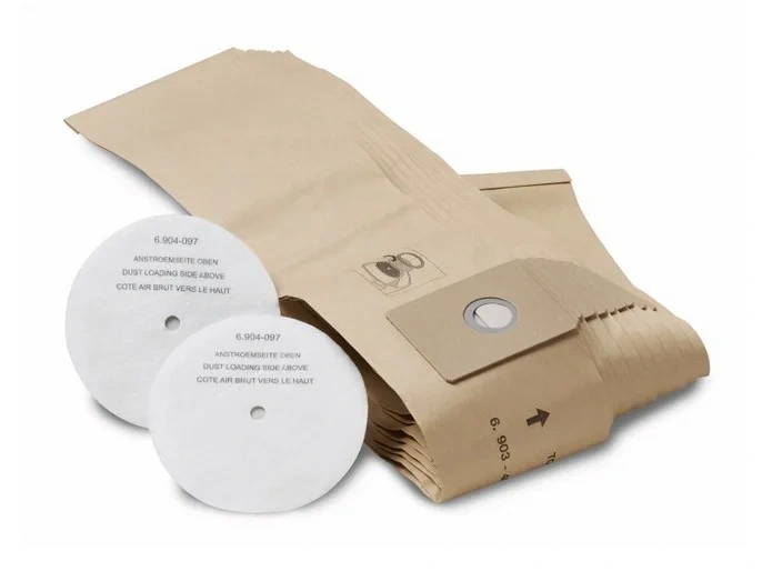 В одной упаковке 10 бумажных двухслойных фильтр-мешков и два фильтра защиты электродвигателя для пылесосов Karcher Т 201.