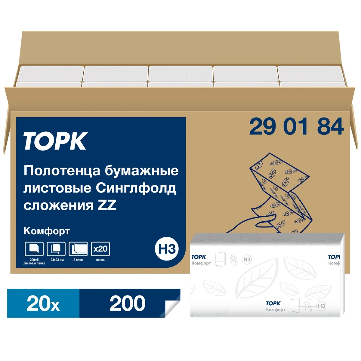 Полотенца бумажные листовые Tellus (Торк/Tork) H3 V-сложение (ZZ) 2-слойные белые 20 пачек по 200 листов (290184)