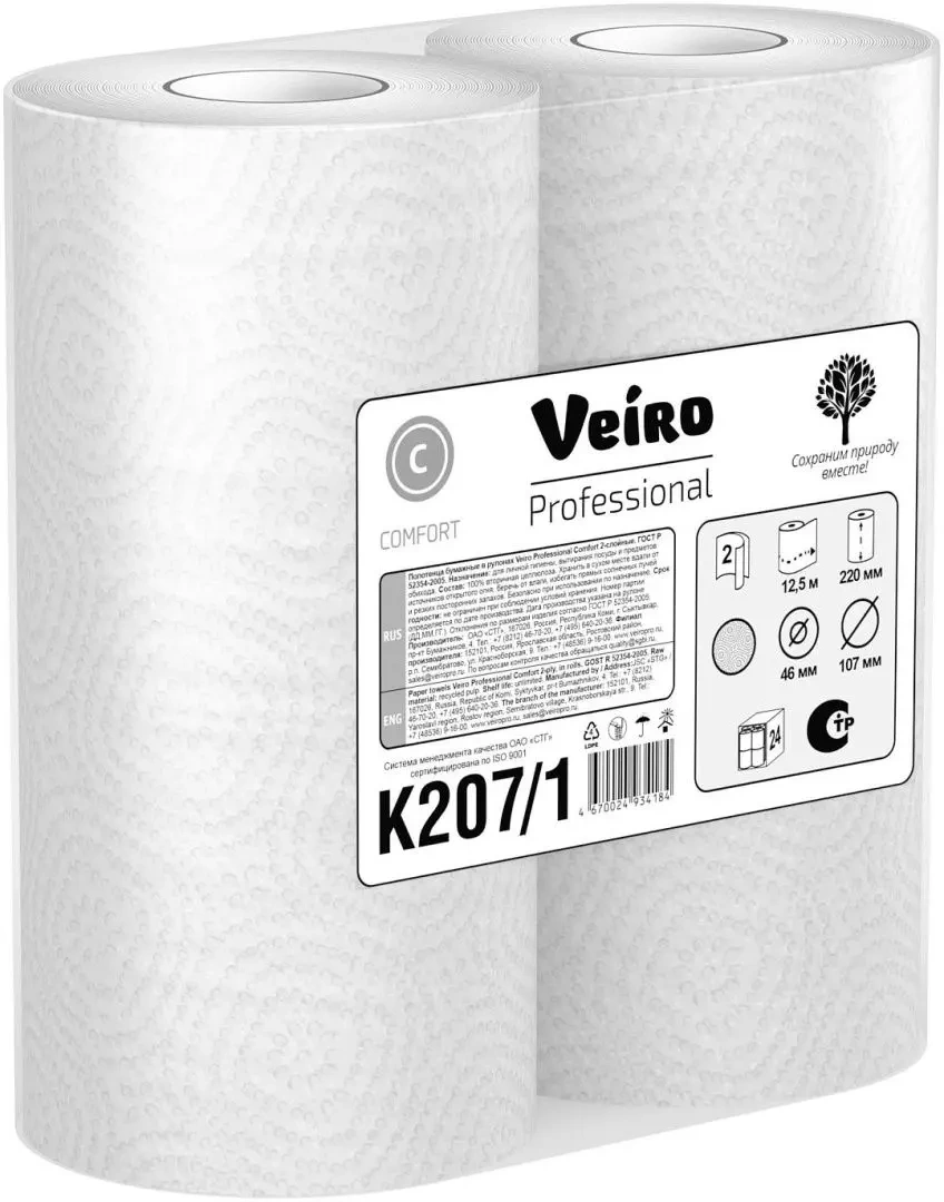 Бумажные полотенца Veiro Comfort 207 К/1, 2 слоя, 2 рулона, белые, 12.5м
