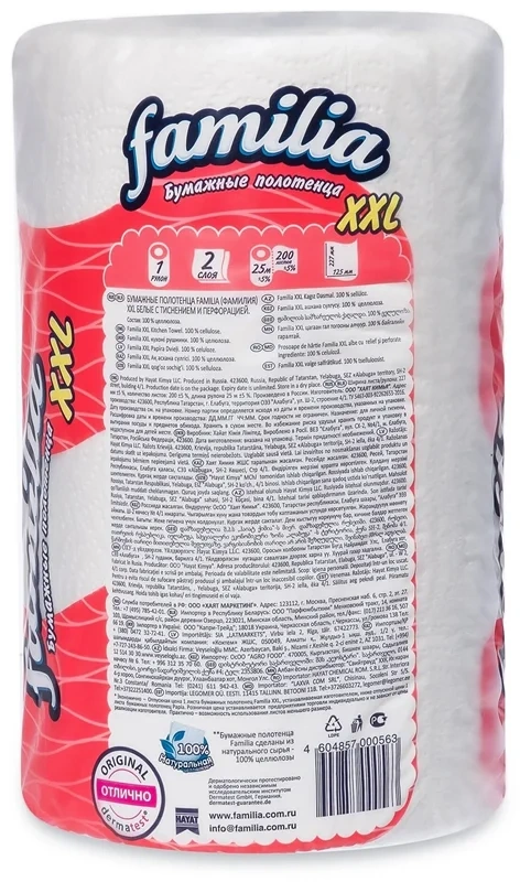 Бумажные полотенца Familia XXL белые, 2 слоя, 200 листов, 1 рулон