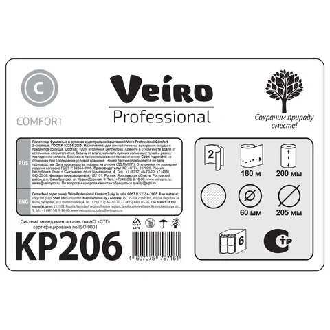 Отзывы о «Бумажные полотенца Veiro Professional Comfort KP206, в рулоне с центр вытяжкой, 180м, 2 слоя, белые, 6 рулонов»