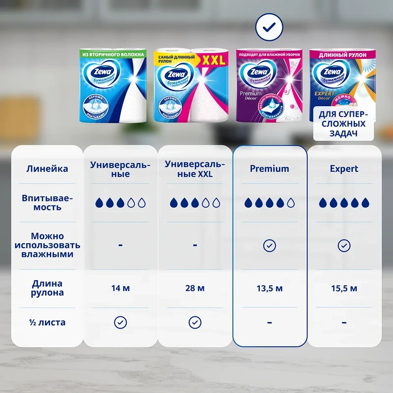 Бумажные полотенца Zewa Premium - незаменимый помощник современной хозяйки. Благодаря специальной текстуре они прочные, отлично впитывают влагу и подходят также для влажной уборки. Используйте бумажные полотенца Zewa Premium на кухне и во всем доме. Белые 2-х слойные прочные бумажные полотенца без рисунка.