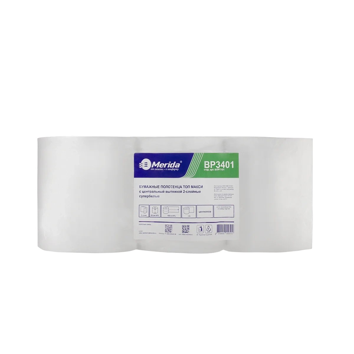 Бумажные полотенца Merida BP3401 в рулоне с центр. вытяжкой, Топ Макси, 2 слоя, белые, 160м, 6шт/уп