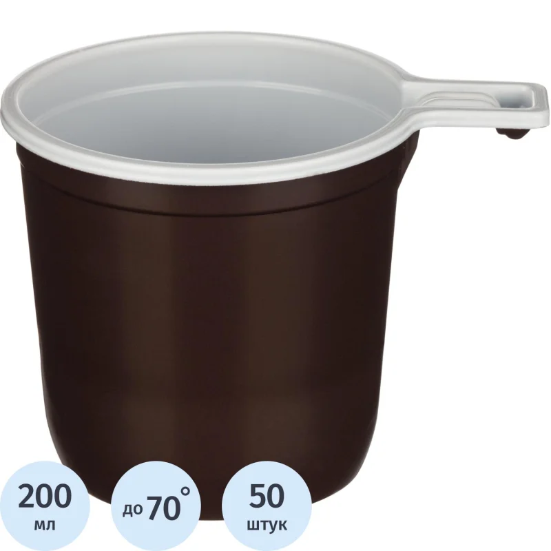Чашка одноразовая пластиковая 200 мл коричневая/белая 50 штук в упаковке Комус Бюджет Одноразовая чашка Комус двухцветная, коричневая с белым. Ручка делает использование более комфортным, не позволяя обжечься. Полипропилен, из которого изготовлена чашка, выдерживает высокие и низкие температуры. Объем - 200 мл. В упаковке 50 штук, в транспортном коробе 25 упаковок. Данная продукция обладает пониженной плотностью/весом, при некорректной транспортировке или использовании возможна деформация и механические повреждения (разрыв). Верхний диаметр: 74 мм. Нижний диаметр: 52 мм. Высота: 70 мм. Область применения: посуда одноразового использования для холодных и горячих пищевых продуктов. Во избежание деформации ручки, использовать при температуре воды не более (70 5) С. Товар произведен под контролем 'Комус'. Мы специально позаботились о Партнерах, которые превыше всего ценят качество и комфорт и разработали линейку Одноразовой посуды самых востребованных размеров для обеспечения быстрого питания в офисе, образовательных и производственных учреждениях, сферы гостеприимства и общественного питания и многих других. Производство расположено в России, что гарантирует постоянный контроль качества и оптимальные цены. Законодательные и технические документы.
