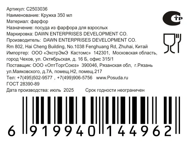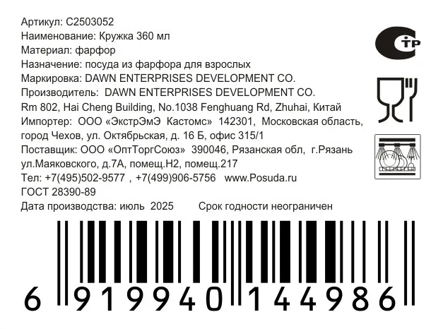 Кружка Добруш 300мл, фарфор, белая, 3С0066Ф34