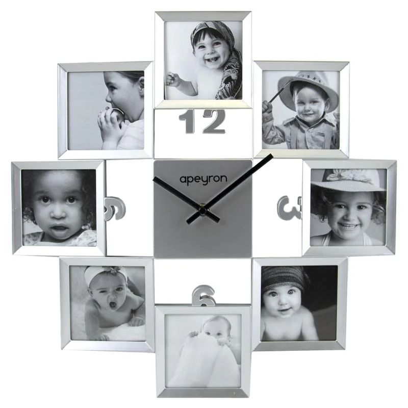 Домашний интерьер не возможно, представить себе, без необходимого атрибута — настенных часов. Каждый выбирает часы по своему вкусу и подходящему стилю. Функциональность часов не должна уступать их внешнему виду. Превосходно иметь часы-фоторамку, это модно, красиво и очень удобно. Такие часы будут радовать хозяина, и гости оценят такой аксессуар по достоинству. Часы-фоторамка уместно будет смотреться в любой части дома, отличным вариантом являются настенные часы Apeyron RF 9160. Такие часы притягивают внимание присутствующих. Удобный циферблат окружают восемь небольших фоторамок. Самые любимые фотографии, родителей, детей, домашних любимцев, будут всегда на самом видном месте. Корпус изделия привлекательного серебряного цвета. Функциональный негромоздкий размер 35x35x4 см, не будет занимать много места. А абсолютная бесшумность часового механизма прибора будет, несомненно, бесценна. Корпус: пластик/металл. Часы работают от 1 батарейки типа АА (не входит в комплект). Поставляются в картонной коробке. 8 рамок для фотографий (формат 9x9 см).Достоинства часов фоторамки Apeyron RF 9160:— необычный дизайн;— совмещение часов и нескольких фотографий;— механизм плавного хода;— кварцевый механизм, что гарантирует точное исчисление времени;— долговечность прибора.Приобретя часы-фоторамку Apeyron RF 9160, можно испытать только положительные эмоции, внешний вид и качество часов оценит не только молодое поколение, но придется по душе и старшему.
