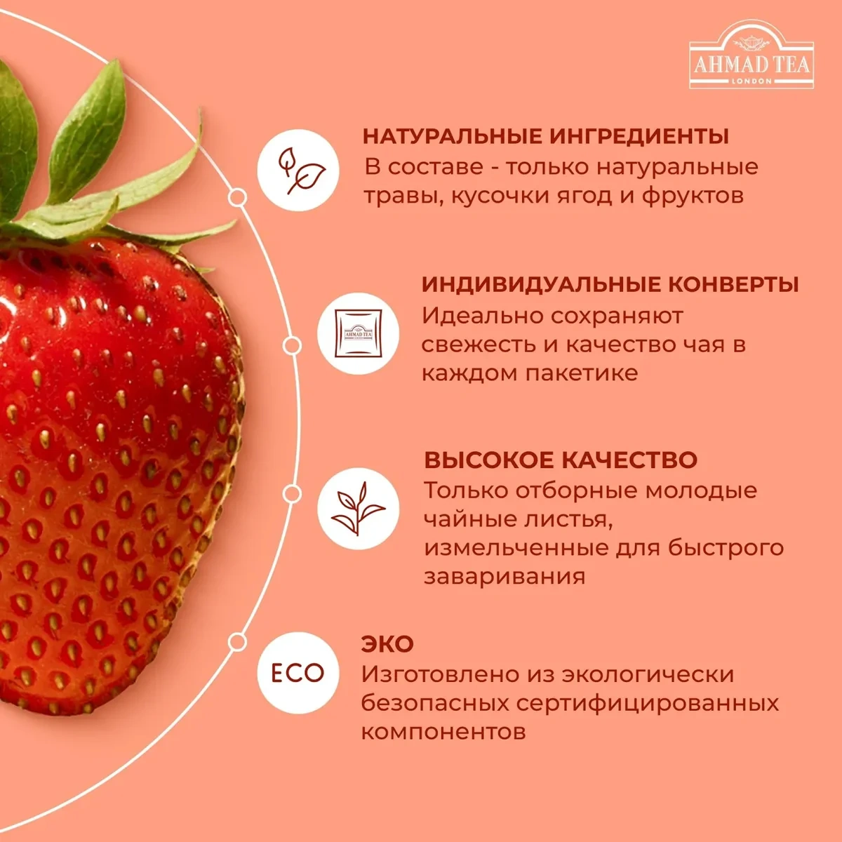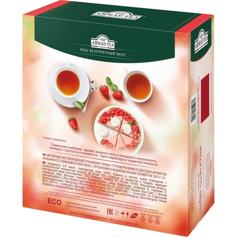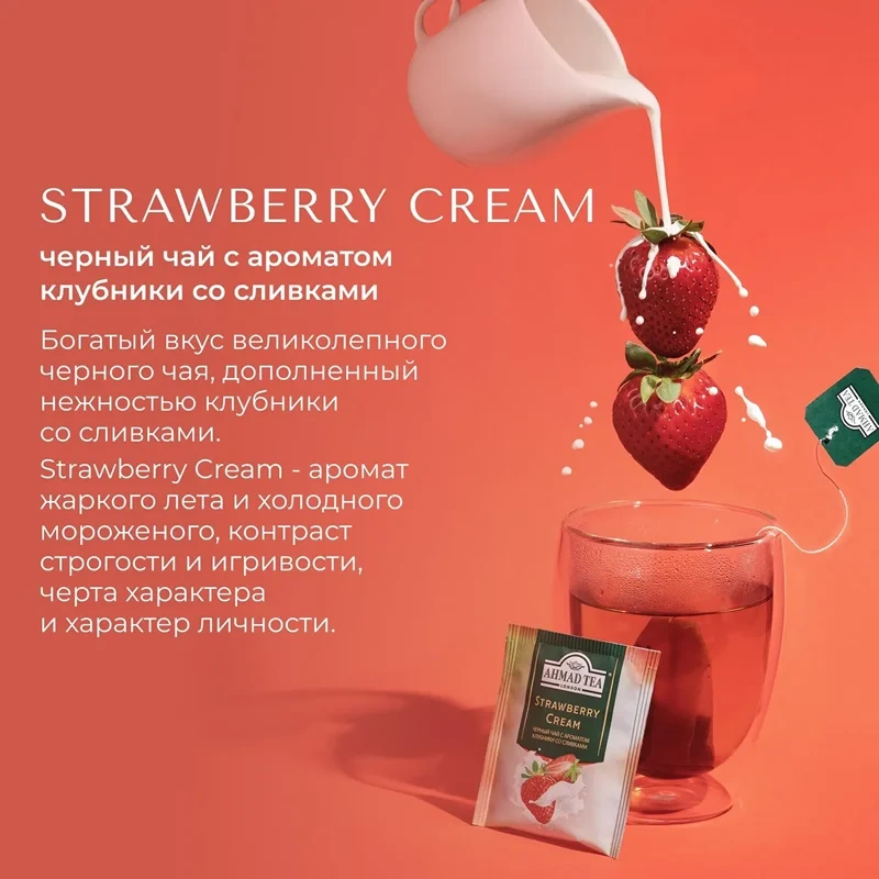 Чай черный Ahmad Tea Strawberry Cream 100 пакетиков (клубника со сливками). Богатый вкус великолепного черного чая, дополненный нежностью клубники со сливками.