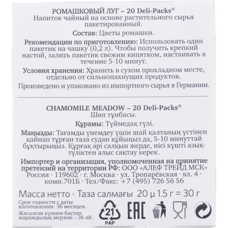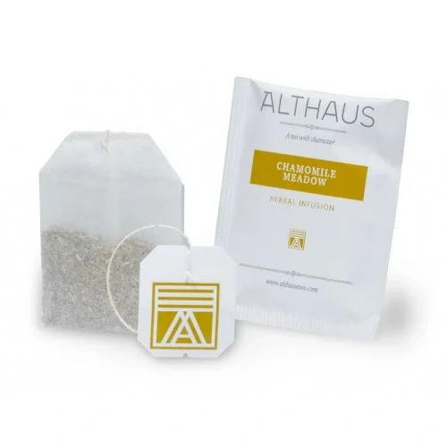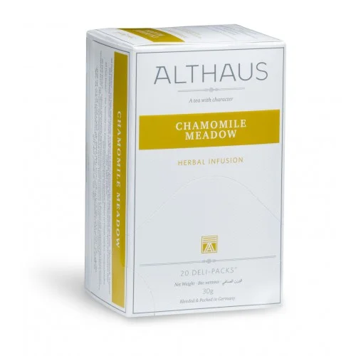 Чай травяной Althaus Chamomile Meadow 20 пакетиков. Этот нежный, ароматный и успокаивающий чай изготовлен из соцветий ромашки высшего качества. Обладает характерным приятным пряным вкусом. При изготовлении пакетированного чая Althaus используется то же высококачественное сырье, что и при изготовлении листового чая. Мелкая фракция чая в пакетиках обеспечивает более крепкий настой и быстрое заваривание. Специальная фильтр-бумага, из которой производятся пакетики, не влияет на вкус чая.