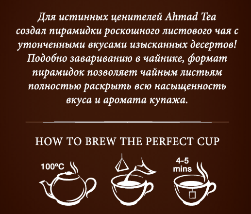 Шоколадный Брауни Ahmad Tea -20 пакетиков в формате пирамидок, наполненных отборным листовым чаем с кусочками какао-бобов, в элегантной упаковке с залитым вечерним солнцем пейзажем озера, окруженного зелеными полями и пышными деревьями. Отведать любимого американского десерта, насладившись нежной начинкой и хрустящей шоколадной корочкой, и не навредить здоровью - очень просто! Шоколадный Брауни от Ahmad Tea – купаж терпкого черного чая провинции Ассам и утонченного чая с плантаций Цейлона, оттенки которых соединяются и подчеркиваются натуральными какао-бобами. Чайные пирамидки - самый удобный формат заваривания для тех, кто по достоинству ценит листовой чай, но нет времени для его заваривания в чайнике. Изысканные и удобные пирамидки с листовым чаем внутри позволяют чайным листьям полностью раскрыть роскошь вкуса и аромата купажа. Побалуйте своих гостей Шоколадным Брауни как более легкой альтернативой десертам или алкогольным напиткам.