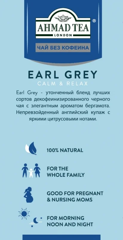 Earl Grey - утонченный бленд лучших сортов декофеинизированного черного чая с элегантным ароматом бергамота. Непревзойденный английский купаж с яркими цитрусовыми нотами.Коллекция чая без кофеина от Ahmad Tea - возможность не отказывать себе в удовольствии наслаждаться любимым напитком в любое время суток.Ароматные декофеинизированные бленды Ahmad Tea созданы с особой любовью и заботой и станут прекрасной альтернативой традиционному напитку. А их изысканный вкус порадует как взрослых, так и детей.