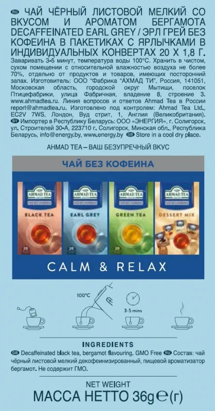 Чай черный Ahmad Tea Эрл Грей без кофеина (1.8г x 20шт), 36г