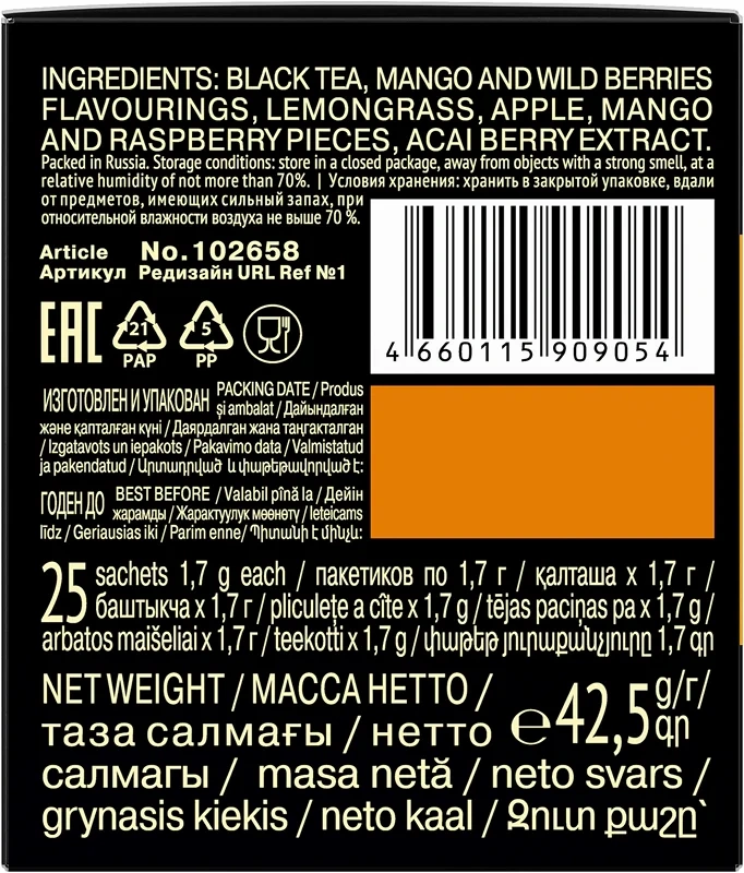 Изысканное, очень вкусное сочетание чёрного чая с кусочкам сочного манго и ароматом ягод асаи. Тщательно отобранные ингредиенты дополняют друг друга, раскрываясь в гармонично сбалансированном купаже. Вкус наполненный, сладковато-ягодный, с фруктовой кислинкой. Яркое сочетание черного цейлонского чая со спелыми фруктами согревает и дарит энергию.