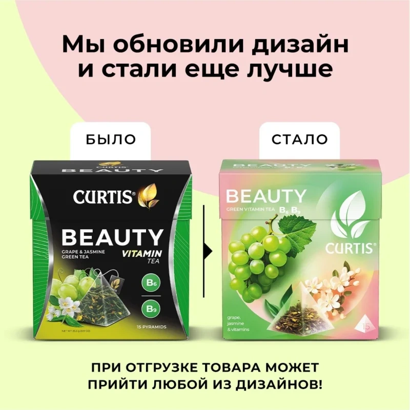 Чай зеленый Curtis Beauty 15 пирамидок (виноград, жасмин). Зеленый чай Curtis «Beauty» 25.5 г 15 пакетиков (пирамидки) — китайский листовой чай, обогащенный витаминами В6, В9. Антиоксиданты зеленого чая, кусочки виноград и сила витаминов способствуют поддержанию красоты и молодости. Насладись чашкой чая Curtis Beauty с изысканным ароматом для естественной красоты. Удивительные сорта чая в купажах Curtis, неожиданные сочетания крупных кусочков ягод и фруктов дарят разнообразие изысканных, ярких вкусов и ароматов. Выпить чашку чая Сurtis — это удовольствие от момента побыть с собой и помечтать. Сurtis мотивирует людей мечтать и осуществлять мечты, рожденные за чашкой чая.