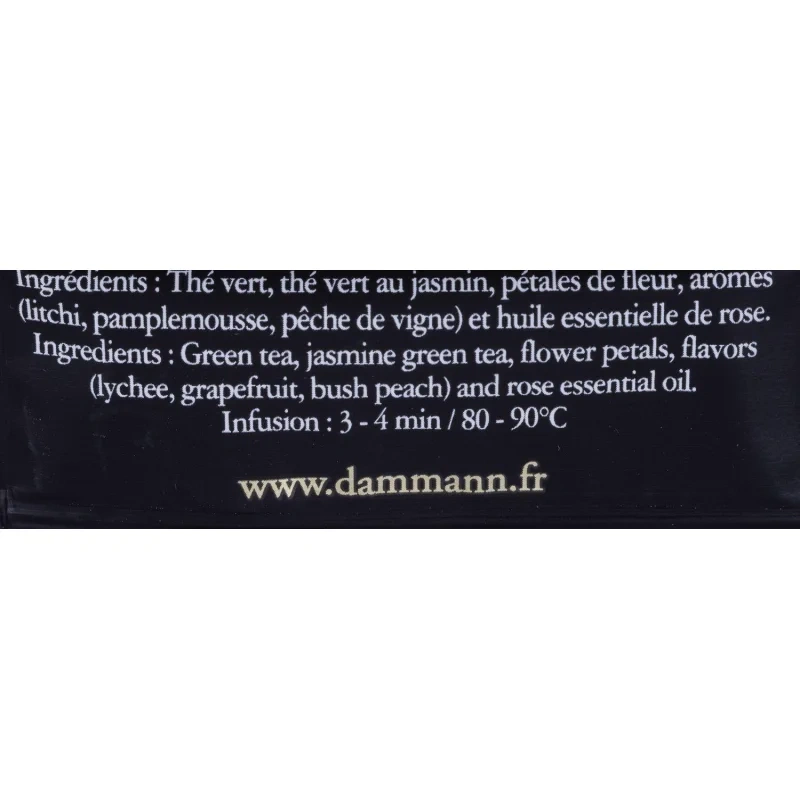 Состав: зеленый чай, жасминовый зеленый чай, лепестки цветов, ароматы личи, грейпфрута, персика и розы.