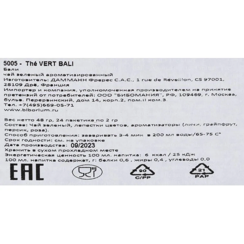 Чай зеленый Dammann Bali 24 пакетика. Чай Damman Bali зеленый — гарантирует своим потребителям постоянное высокое качество чая. Помимо отборного чая, который сам по себе гарантирует высокое качество, компания создает специальные купажи. Специалисты Dammann заботятся о том, чтобы потребитель всегда получал чай одинаково высокого качества. Это приведет к высокой удовлетворенности ваших клиентов и хорошим продажам.