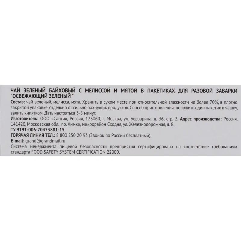 Чай зеленый Grand Освежающий 100 пакетиков (мята, мелисса). Чай Grand Освежающий зеленый изготовлен из зеленого китайского чая, произрастающего в провинции Хунань в который добавлены душистые травы — мелисса и мята. Напиток обладает приятным, нежным вкусом, в котором сочетается легкая терпкость зеленого чая, освежающая пряность мяты и естественный лимонный оттенок мелиссы.